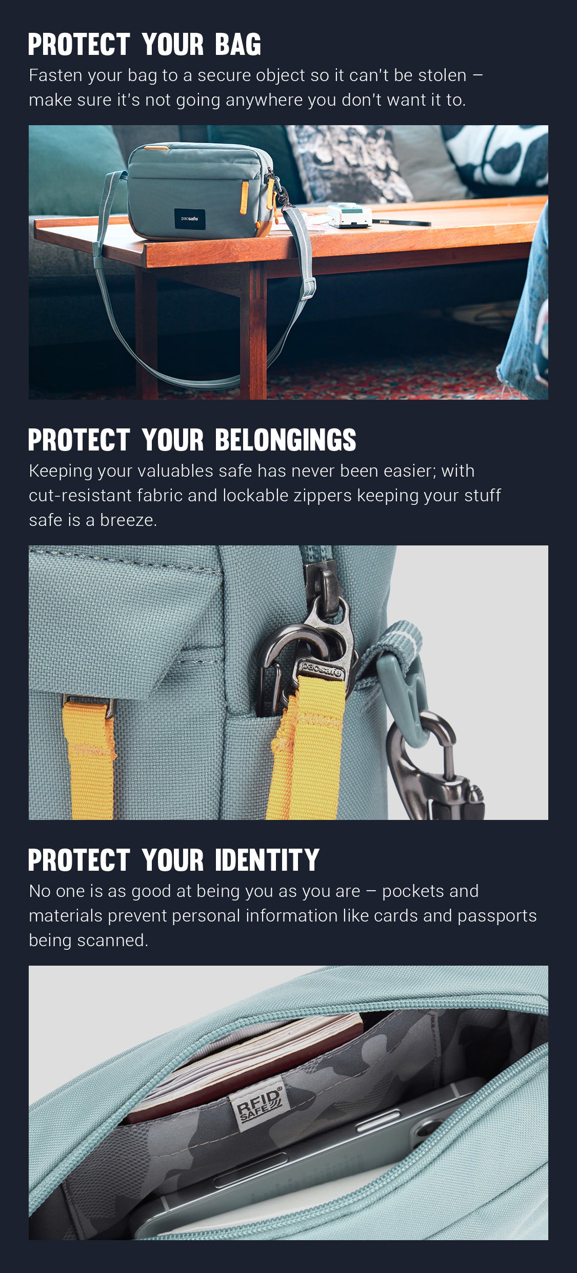 A spacious bag, really well thought out and designed. Everything has been carefully considered to make it as safe as possible. I love the colour as well. Very pleased with the high quality materials used and the quality of construction. This bag will last for years as it is so well made.