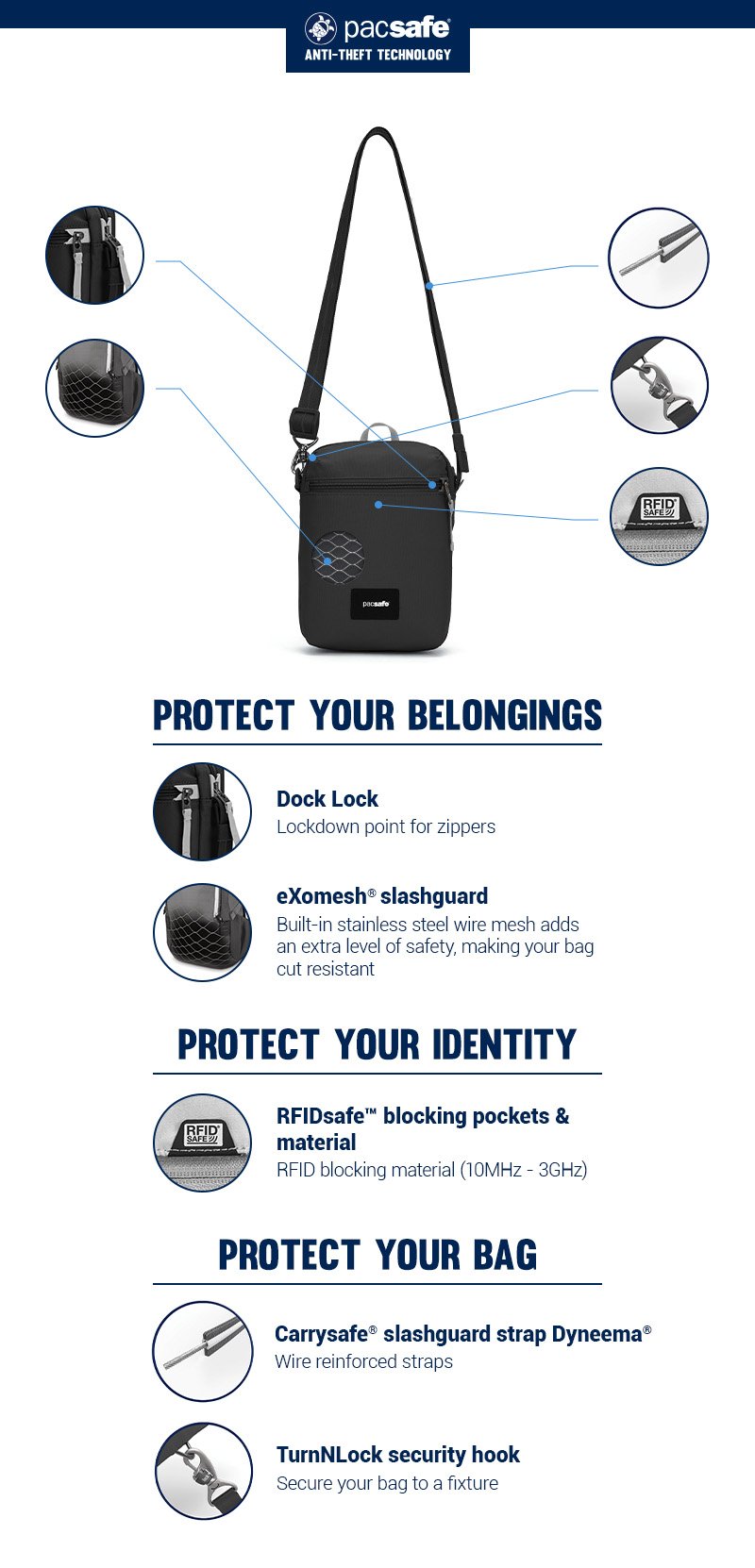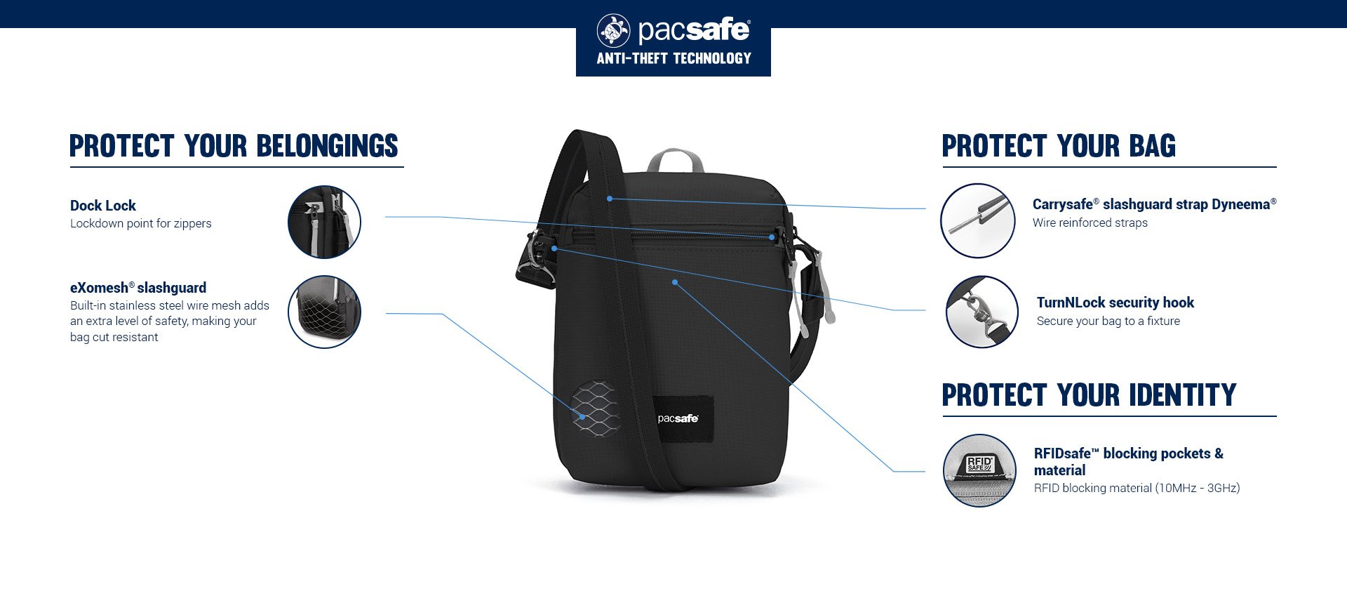 • RFID blocking pocket protects your credit cards and passport against unwanted scans