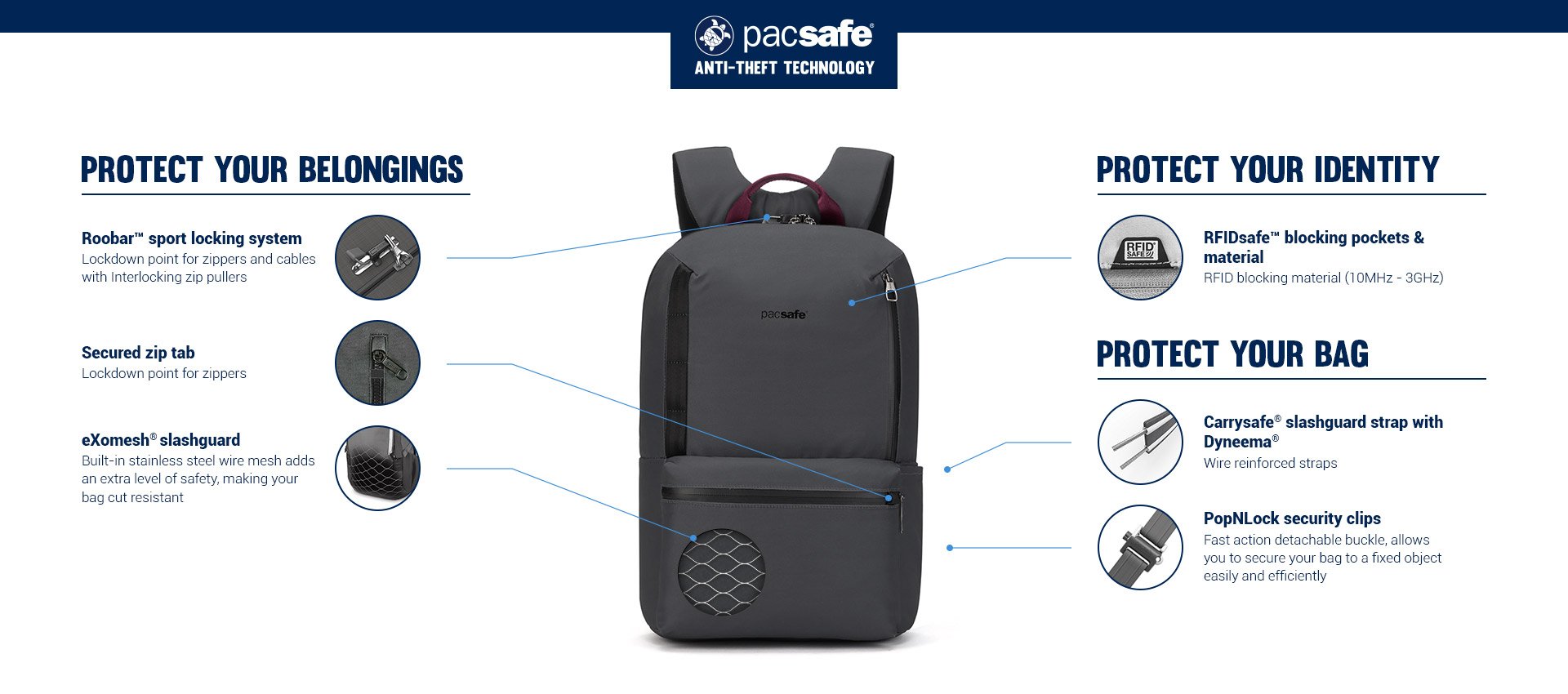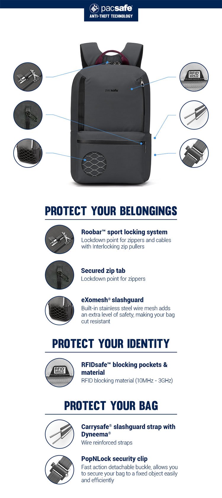 Take on the urban jungle with a slimline anti-theft backpack equipped for city adventures. Organization pockets sort your gear, including a hidden stash for your valuables against your back, while everything is further secured by lockable zips and other anti-theft technology.