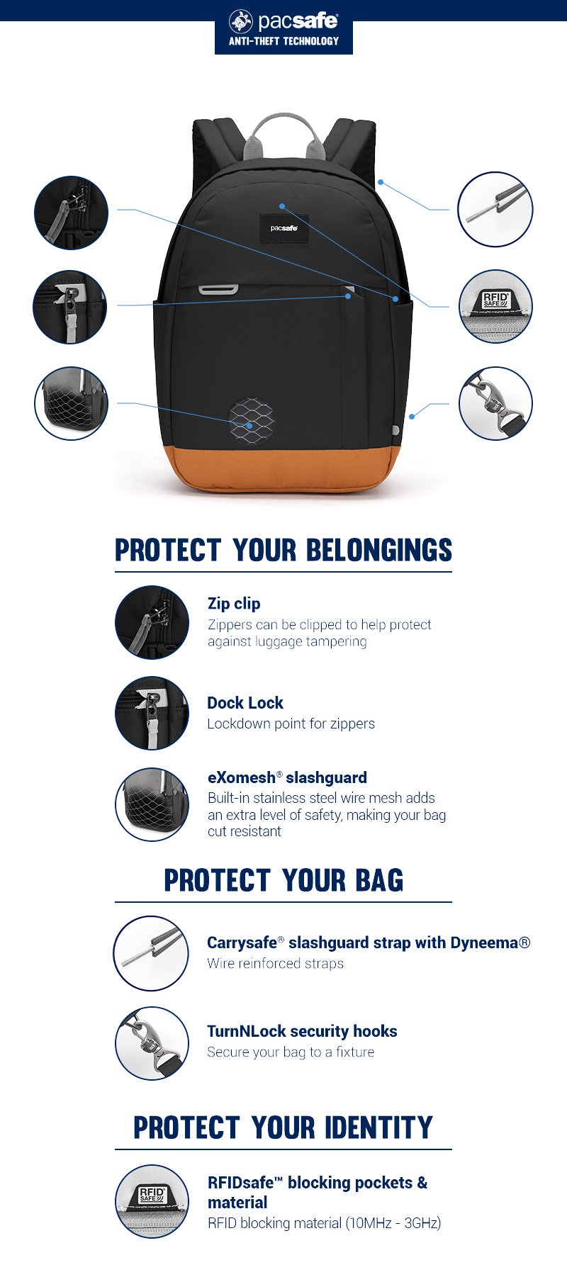 Meet your new favorite everyday anti-theft backpack! Stylish and sleek, this compact design can fit plenty of stuff for your next adventure, including a 13” laptop. There’s even a hidden storage pocket for extra protection to keep important items secure like your phone and wallet. This backpack also features cut-resistant materials and straps, securable zippers, and an RFID blocking pocket. Our GO collection unlocks adventure and possibility with anti-theft security and effortless function. Made from 21 recycled plastic bottles.