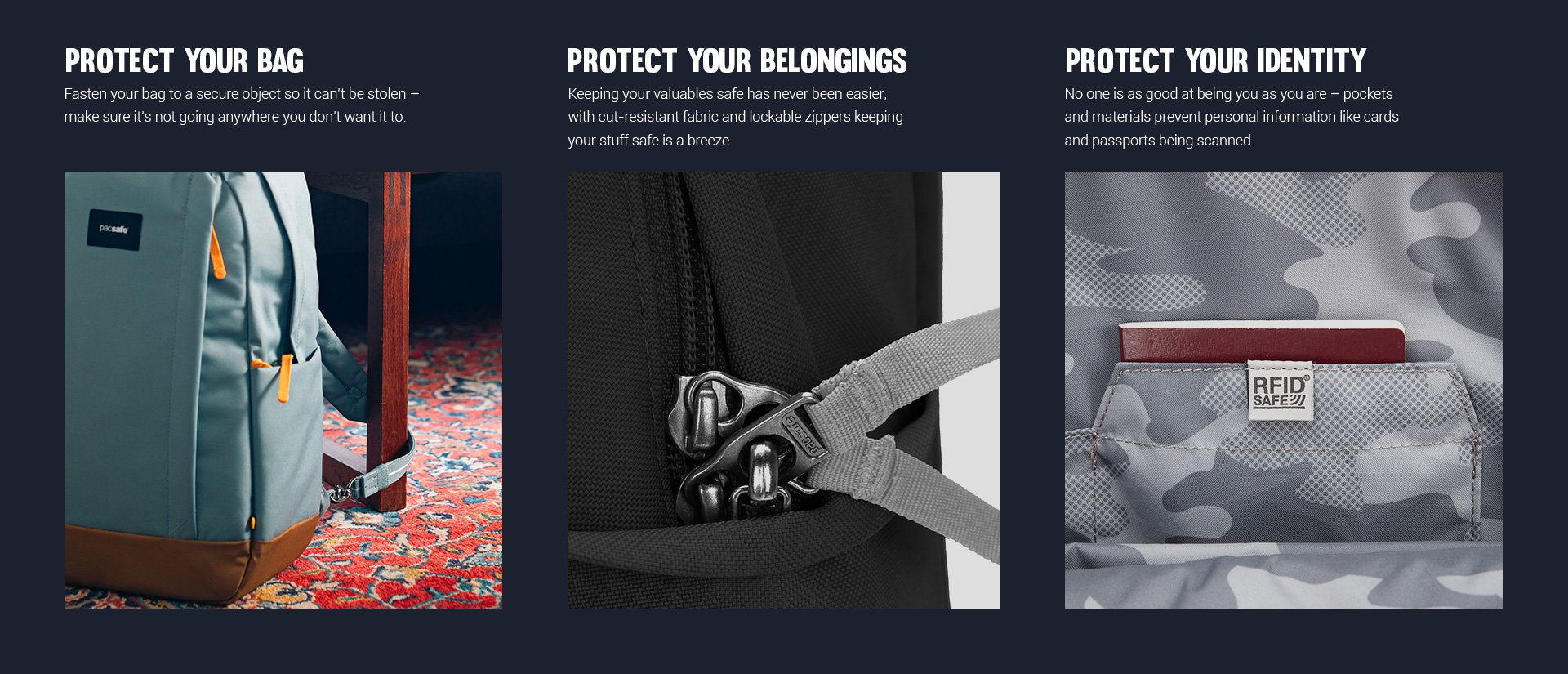 • Carrysafe® slashguard strap with Dyneema®