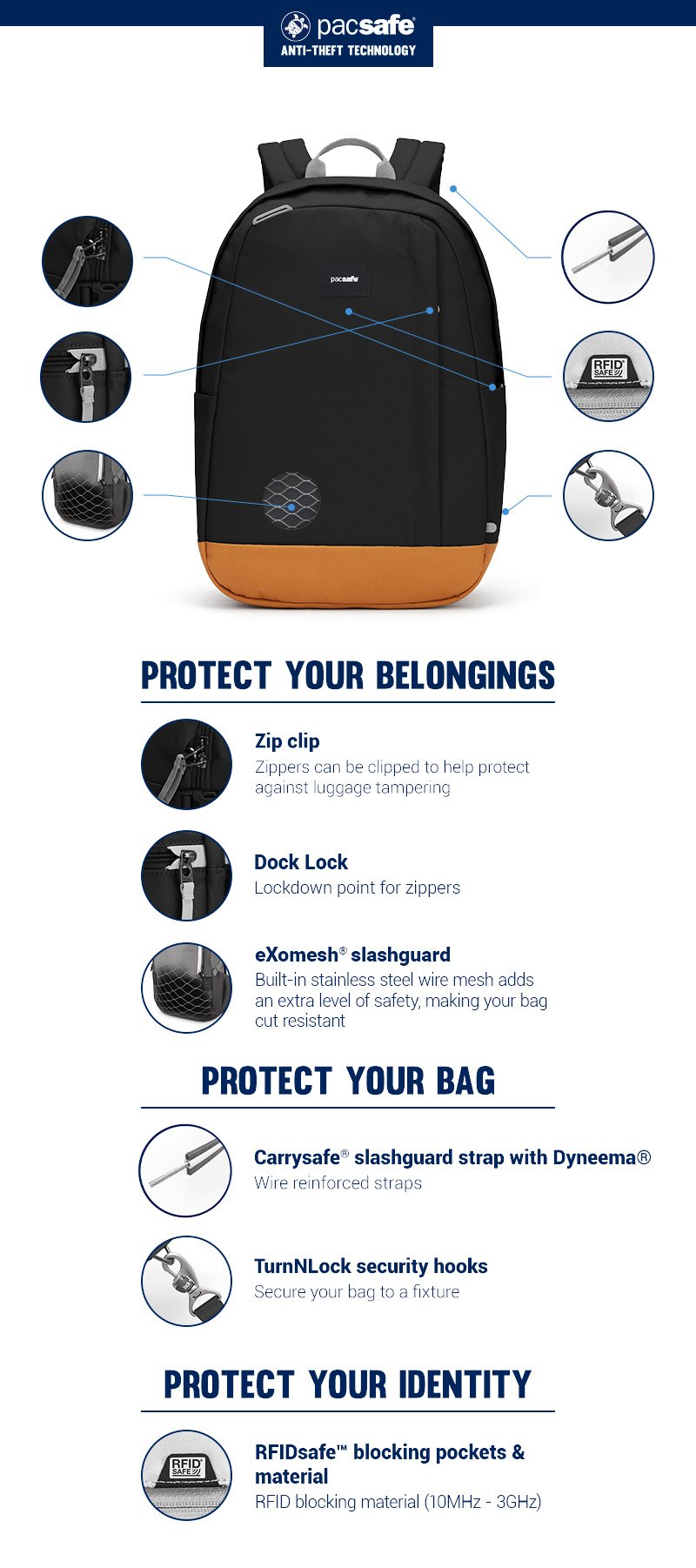 Spacious and practical, this durable anti-theft backpack is designed to fit all the essentials you need, including a padded compartment for your laptop, a luggage slip, and side pocket for a reusable water bottle. There’s even a hidden storage pocket for extra protection to keep your phone and wallet. This backpack features cut-resistant materials and straps, securable zippers, and an RFID blocking pocket. Our GO collection unlocks adventure and possibility with anti-theft security and effortless function.