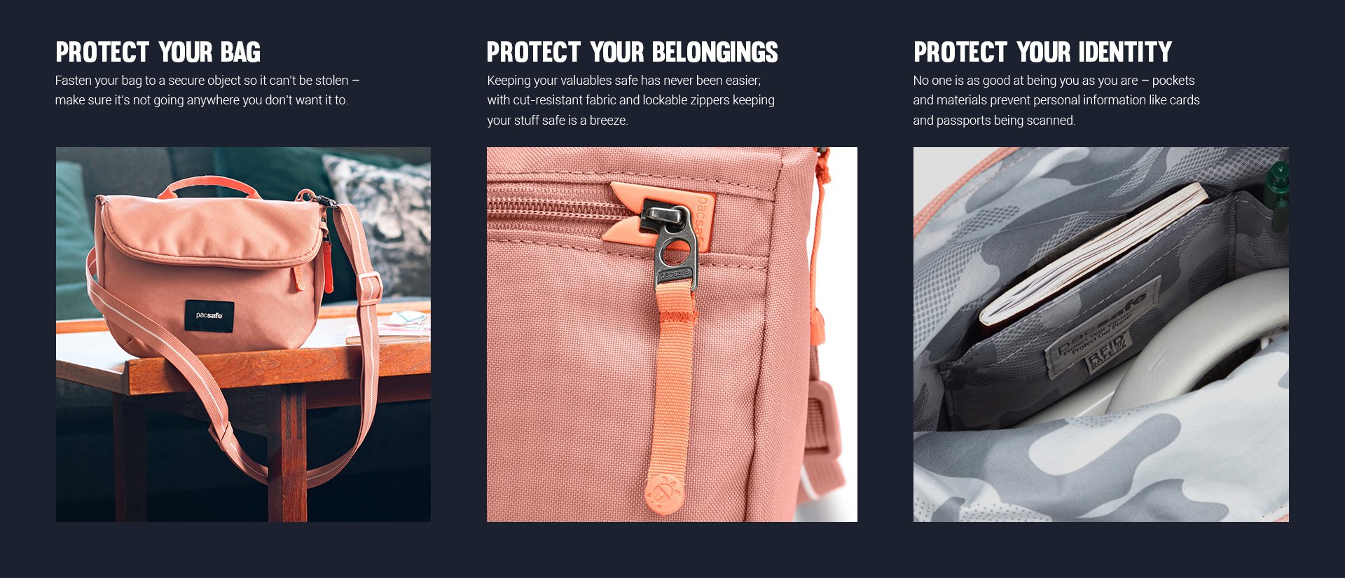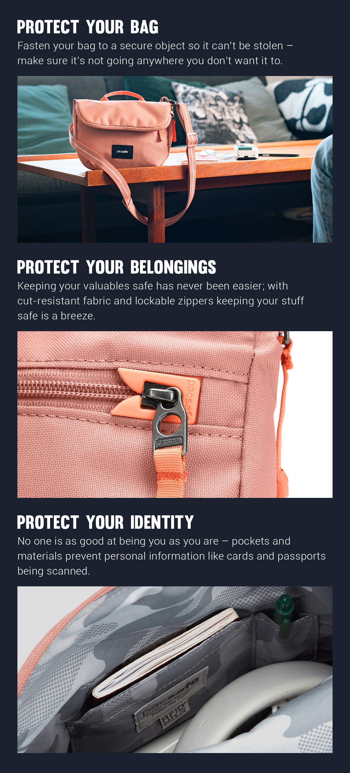 I purchased this for travel and it helped with feeling my passport and credit cards were safe. I also purchased the compact travel wallet and a lanyard. I took it on a trip to Alaska this summer and it was a great size to carry wallet, phone, water bottle and a snack while out for the day. The front zip pocket was perfect for my phone. I did keep trying to slide my phone in the back of the bag-a small zip pocket there would be great. With the increase in thefts/scammers I may use it or at least the wallet for everyday. Great product!