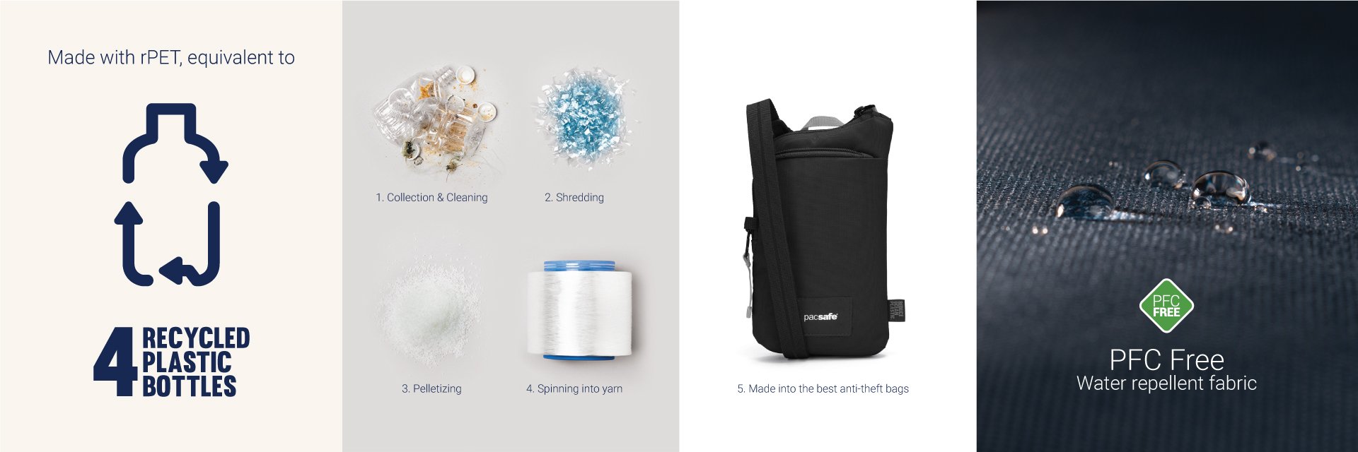 This product is made with post-consumer recycled polyester (rPET), equivalent to 4 recycled plastic bottles, and is treated with a 100% PFC-free water repellency.