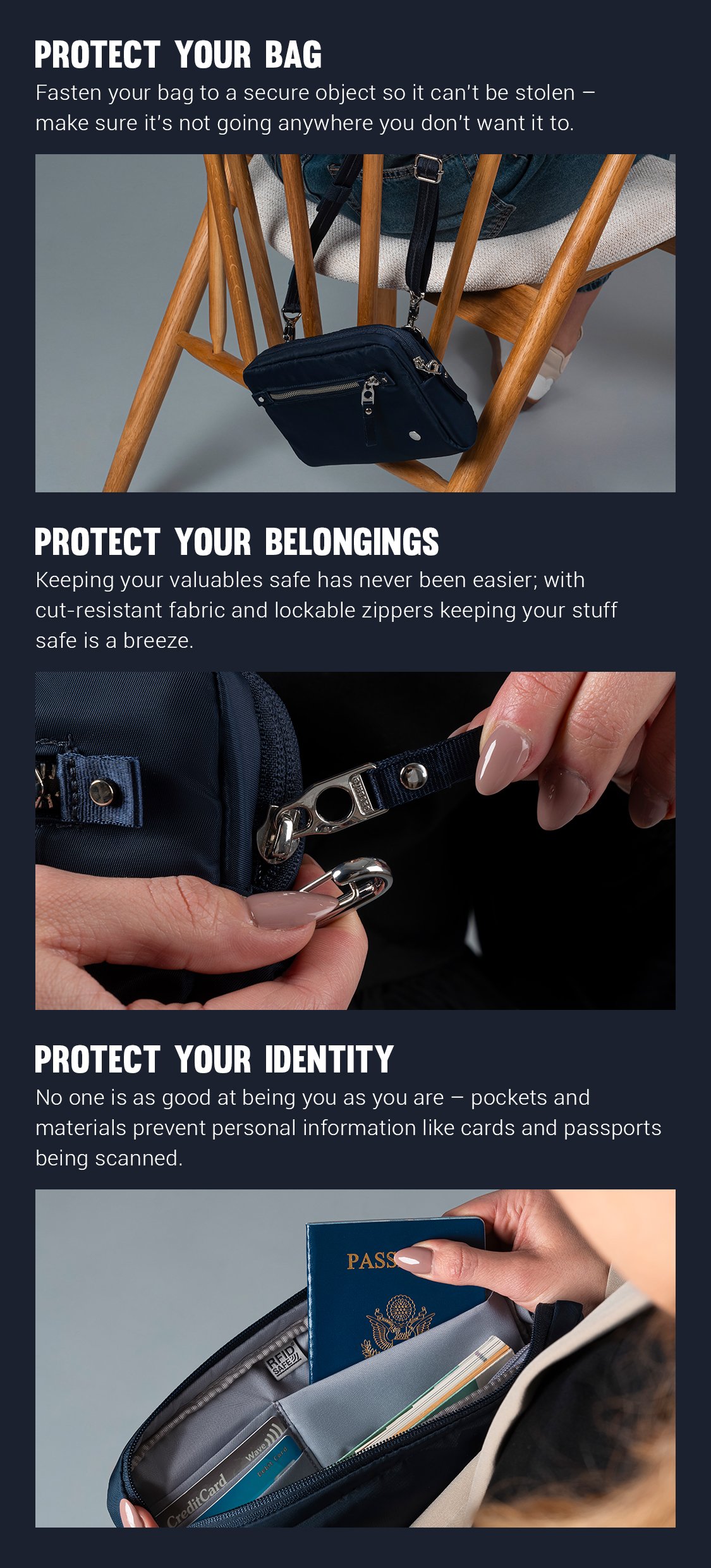 • Cut-resistant anchor strap secures around a fixed object to protect your bag