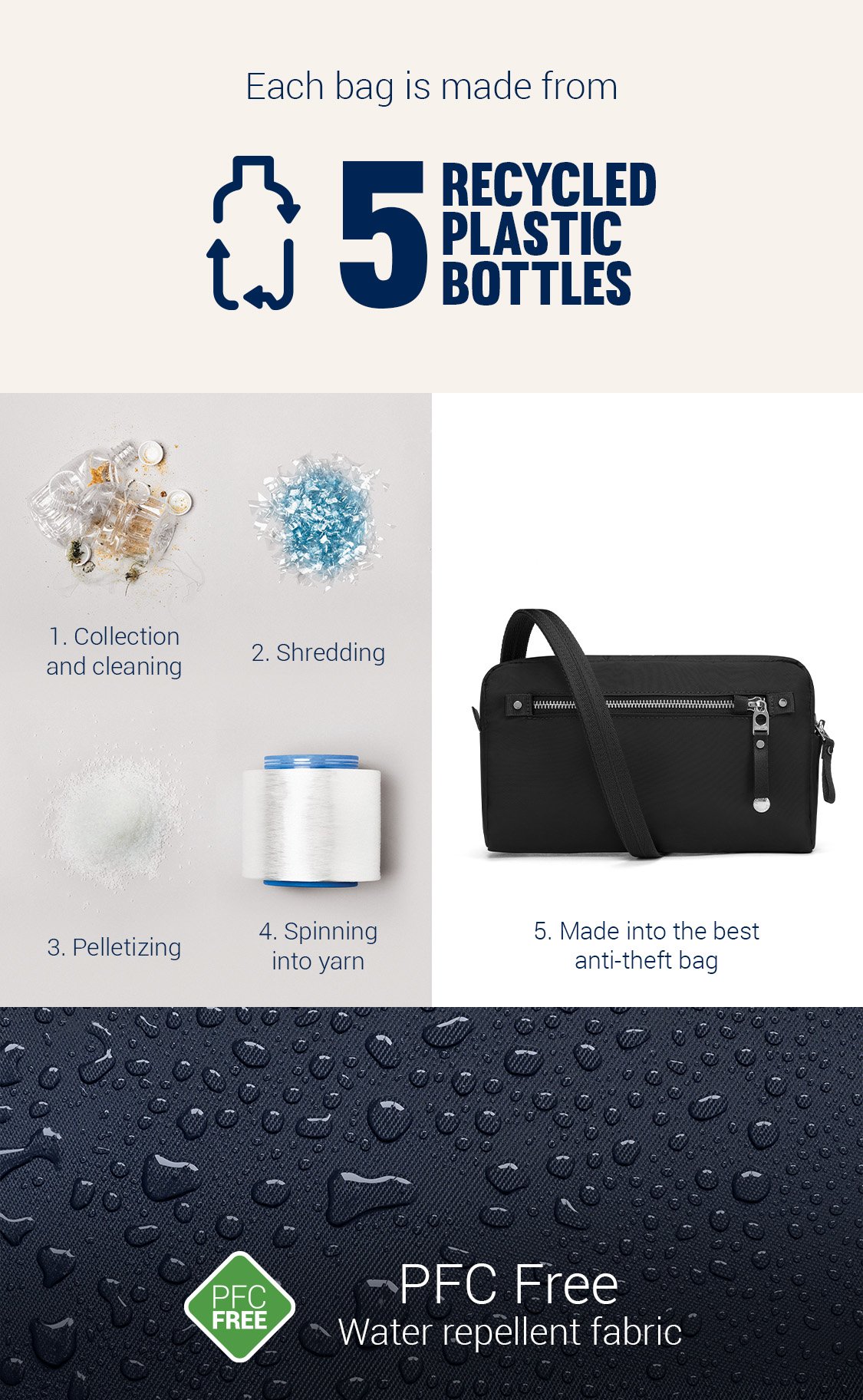 This product is made with post-consumer recycled polyester (rPET), equivalent to 5.0 recycled plastic bottles, and is treated with a 100% PFC-free water repellency.