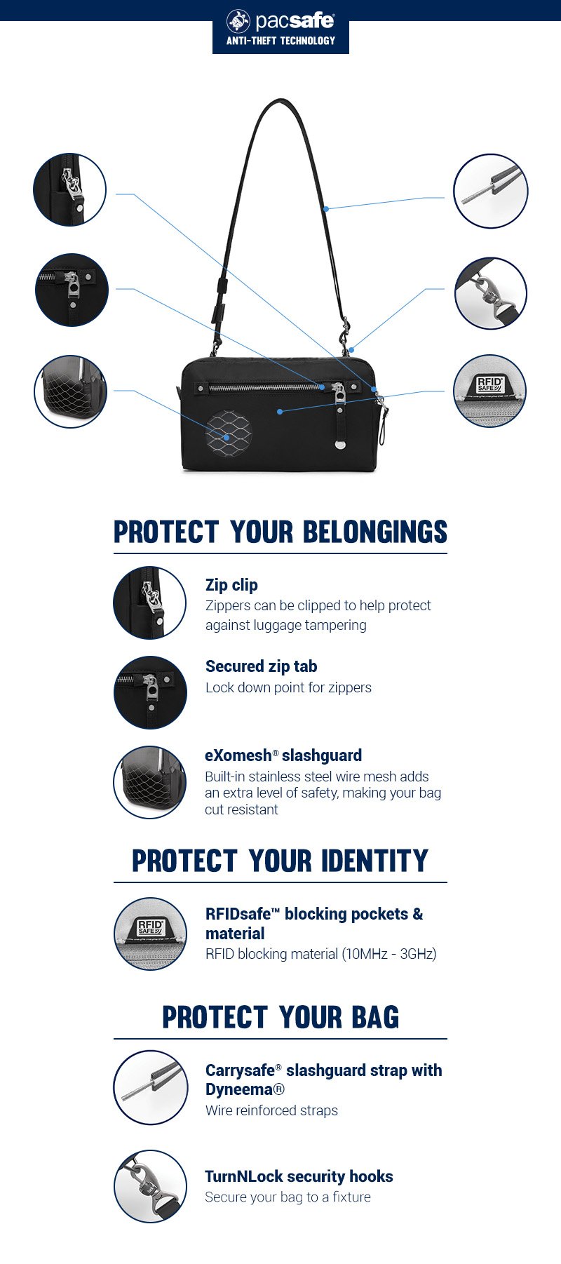 • Smart zipper security and cut-resistant materials protect your belongings